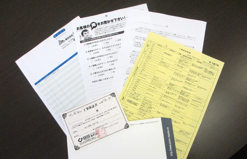 工事の完了後、請求書を郵送させていただきます。今回工事をした場所の保証書やアンケート用紙なども同封いたします。ガイソーの工事について率直なご意見をいただくことで、さらにご満足いただけるサービスをご提供いたします。